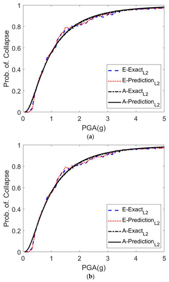 Figure 9 shows the model performance based on the fragility curves according to the GPR model with a PCA of 97%. This figure indicates the curves based on the IO, LS, and CP levels. From the figures, we can determine that the predicted curves match closely the empirical curves.
