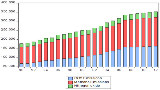 Second: Pakistan is the 5th vulnerable nation to climate change which is frequently affected by the extreme climate events of 1552 from 1999 to 2018. Figure 2 shows the annual pattern of GHG releases (including carbon dioxide, nitrogen dioxide, and methane emissions) for 1990–2014. On X-axis there are years while on Y-axis there is CO2 emission, Methane emission, and Nitrogen oxide.
