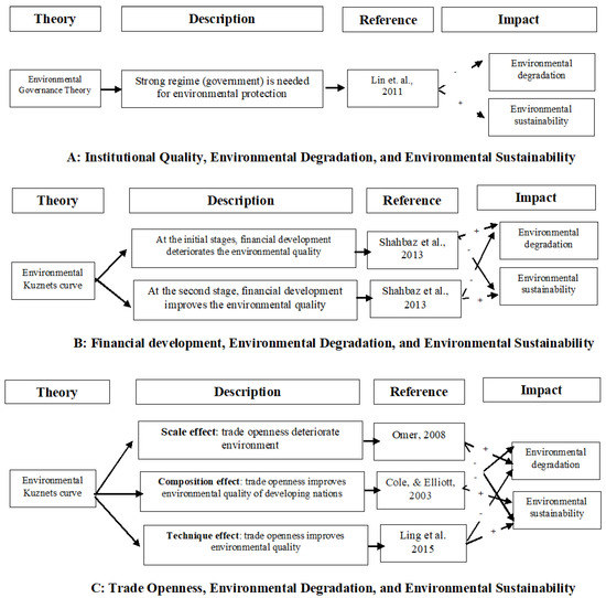 The relationship between Institutional quality, environmental degradation, and environmental sustainability is justified with the help of environmental governance theory and are shown in Figure 3A. The theory indicates that we need a strong regime for protecting the environment. The advocates of environmental governance theory portray a direct association between institutional quality and environmental sustainability. The theory concluded that governance of a country is one of the fundamental factors for guaranteeing efficient environmental management as it organized activists for protecting the environment, which improves the environmental quality that ultimately leads towards sustainability [28]. Thus, the theory of environmental governance provides the theoretical links to expecting a significant relationship institutional quality, environmental degradation, and environmental sustainability.
