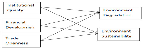 This section highlights the theoretical reasons for expecting the linkage between financial development, institutional quality, trade openness, environmental degradation, and environmental sustainability. The theoretical model of the study is shown in Figure 3, which is proposed by two theoretical perspectives that are environmental governance theory and environmental Kuznets curve (EKC) by Grossman and Krueger 1991.