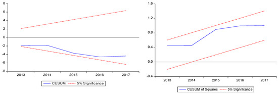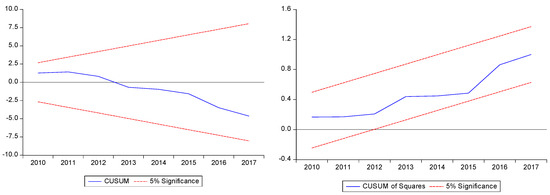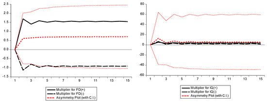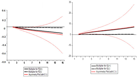 The results of Model 2 indicate that there is a significant asymmetric long-run relationship between IQ and ES. However, a positive shock to IQ will increase ES (β = 1.453280 *) while a negative shock to IQ has an insignificant association with ES (β = 0.097107). Similarly, results confirm the asymmetric long-run relationship between FD and ES; a positive shock to FD will increase ES, and the negative shock causes a decrease in ES [43]. However, the size of the impact of the negative shock on ES is greater (β = 5.416740 *) than the impact of the positive shock on ES (β = 4.474262 *).