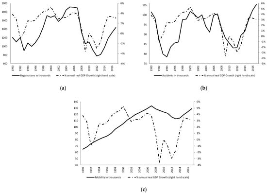 First, we introduce the Spanish automotive market variables for the period 1990–2017. See Figure 2. The number of vehicle registrations is a procyclical variable, which moves in line with the economic cycle and, furthermore, it normally moves in advance of the cycle in such a way that it grows in expansion periods (1995–1999, 2002–2006), which are the opposite of what happens in slow–down phases (2000–2002) and/or economic recessions (1990–1993, 2006–2012). On the other hand, the accident variable, which is introduced into the mobility model, and the automobile fleet, reached a peak in 2017. Finally, mobility only declines during the Great Recession (2008–2013), i.e., during a non–cyclical private balance–sheet recession [36,37], where a key variable such as total population stopped increasing, thus, began declining.