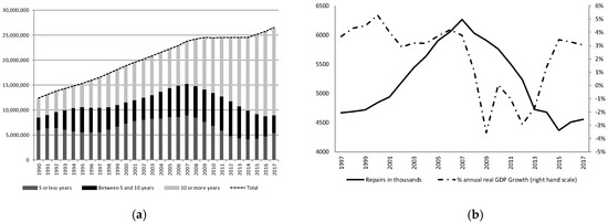 Spanish auto–market variables: (a) automobile fleet and its age (1990–2017); (b) bodywork repairs (1997–2017).