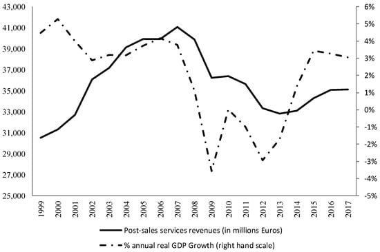 The mean annual revenues, in real terms, of car post-sales services sectors for the period 1999–2017 was 35,776 million Euros. The maximum level was reached in 2007, during the height of the real estate bubble, and the minimum in 2013, at the end of the Great Recession. Thus, post–sales services sectors’ revenues are a procyclical variable. It grew from 1999 to 2007, at a rate of 3.8%, which means practically the same as real GDP. However, the revenues from automobile post–sale services during the Great Recession declined at rates exceeding 14%, far above the fall in real GDP, which was around 1% during that period. The negative change in personal disposable income and the situation of the Spanish employment market, which improved with some delay, may explain the sharp decline in the sector in excess of the actual GDP figures.