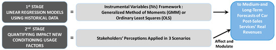 This study proposes a methodology which is conducted in two stages. Firstly, we estimate, using regression models, the most important variables for the automobile sector that can affect the long–term forecasts of the automotive aftermarket’s revenues. Based on those forecasts, we estimate the revenue projections for the automobile post–sale services sectors. Secondly, we apply participatory methods to quantify the impact of the new conditioning usage factors. The proposed methodology is based on stakeholders’ perceptions, this is, the opinions of a panel of various Spanish aftermarket car service sectors experts that will help us to evaluate the impact of the new conditioning usage factors on certain key variables (registrations; fleet; mobility; bodywork and paint repairs; and mechanical, electrical, and maintenance repairs). A series of assumptions have, therefore, been applied regarding three scenarios (minimum, neutral, and, finally, maximum). Based on the data obtained, the real revenues for automobile post–sale services are re–estimated for three scenarios (minimum, neutral, and maximum) and various types of vehicle fleets: fleet without assuming the existence of conditioning usage factors; autonomous and electric; non–autonomous electric fleet; fleet of cars with ADAS level 3; fleet of shared cars; impact on the fleet of the legal and environmental framework; and the rest.
