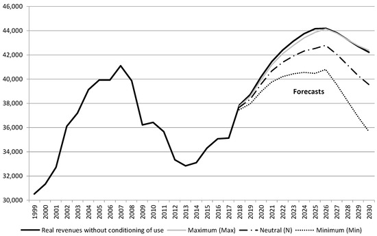 Figure 6 presents the change in the forecasts for revenues in real terms for the post–sale services sector for the period 2018–2030 in the case of non–conditioning usage factors, as was done in Section 4.1, and the total figures with conditioning usage assumptions taken into account in the three analyzed scenarios (minimum, neutral, and maximum).