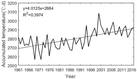 - Yan, M.H.; Liu, X.T.; Zhang, W.; Li, X.J.; Liu, S. Spatio-temporal changes of ≥10 °C accumulated temperature in northeastern China since 1961. Chin. Geogr. Sci. 2011, 21, 17–26. [Google Scholar] [CrossRef]