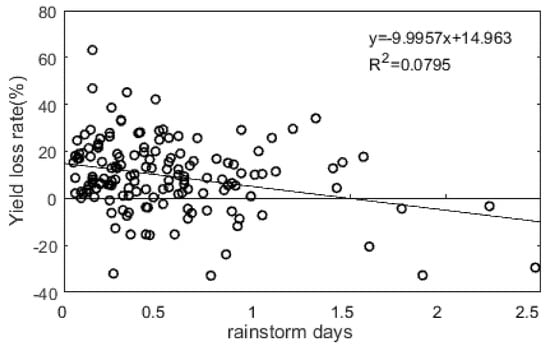 | Province | Year | Yield Loss Rate (%) | Drought Index (AD) during May–September | Low Temperature Index during May–September | Rainstorm Days in August and September |