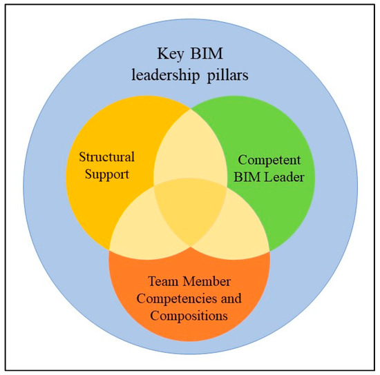 One of the primary challenges to BIM implementation is the selection of competent team members. While BIM leaders and managers tend to focus primarily on the technical and financial aspects of implementing BIM systems, the behavioral aspects involved in BIM implementation are a key consideration. BIM leadership aspects can be categorized into the three domains of: structural support, competent BIM leaders, and team member competencies and composition (key BIM leadership pillars). These aspects are depicted in Figure 1. Structural support deals with aspects such as organizational support, financial support as well as rewards and recognition [30]. Competent BIM leadership refers to the facilitating roles leaders can assume to empower and/or coach team members as well as to demonstrate transformational behaviors throughout the BIM implementation process. The third category includes the competency identification, acquisition, and assessment of individuals as well as team and group composition involved in BIM implementation by BIM leaders [12]. The literature review shows that, while aspects related to structural support and individual and team competences and composition have garnered the most attention, the BIM leadership domain has been relatively overlooked [30]. Therefore, this paper aims to discuss the identification and application of leadership competencies in the context of BIM implementation as a way of maximizing both the effectiveness of other team members and the overall benefits from BIM workflows.