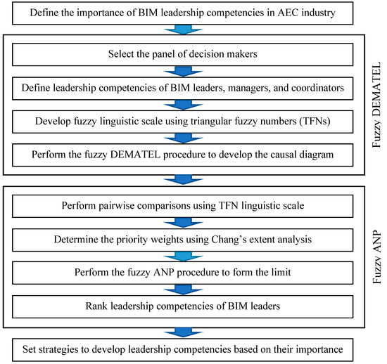 The remainder of this paper is organized as follows: Section 2 reviews the literature on building information modeling (BIM), its required skills, and leadership studies and findings. Section 3 introduces the research methodology, fuzzy DEMATEL, and fuzzy ANP. Section 4 and Section 5 contain the empirical study, discussion of the results, and practical implications. Finally, Section 6 concludes the paper.
