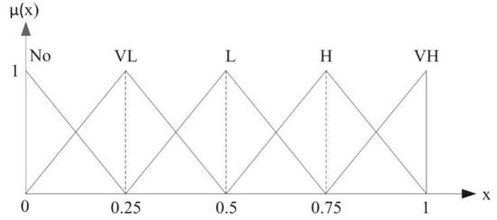 The five linguistic terms used in this study were “Very high,” “High,” Low,” “Very low,” and “No” influence. Table 2 shows the fuzzy scales of these linguistics. Fuzzy linguistic values and their membership function are depicted in Figure 3.