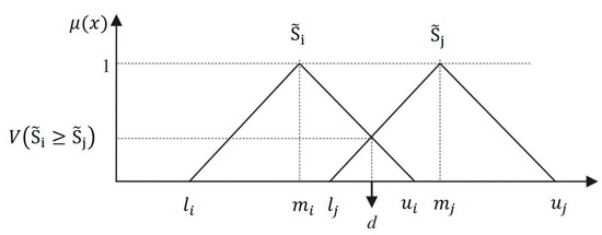 To minimize human assessment errors, a linguistic variable should be defined. Linguistic terms, like words or sentences, define a linguistic variable. Let on X is a triangular fuzzy number (TFN) where denote the lower, medium, and upper values of the fuzzy numbers. Its membership function must follow Equation (1).