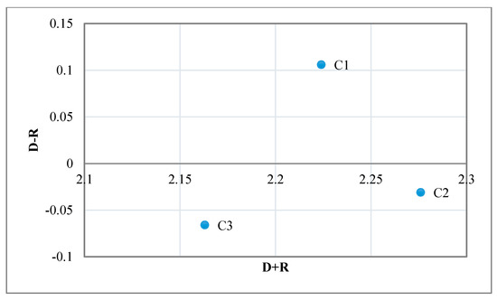 Vectors and are the sum of rows and the sum of columns, respectively, within the total-relation fuzzy matrix . By adding to , the “Prominence” horizontal axis vector is calculated, which shows the importance of criterion i. This vector shows how much importance each leadership competency has. By applying Equation (11), the fuzzy numbers of vectors and are defuzzified into crisp values.