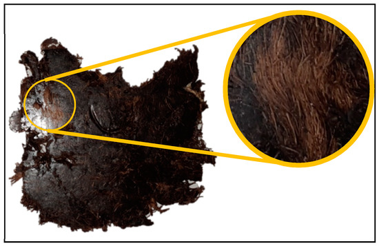 - Principle 35: change of parameters (physical states). After preparing the first mixture of coconut fiber (11.11%), TPS–EVOH (55.56%), and SBR (33.33%), it was observed that the homogeneity of the mixture was not as desired (see Figure 3); therefore, Principle 35 was applied to change the physical state of the coconut fiber. For this, the coconut fiber was ground in a conventional mill and sieved to obtain fiber microparticles and, thus, improve this factor.