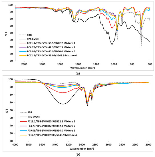 - Méndez-Hernández, M.L.; Rivera-Armenta, J.L.; Sandoval-Arellano, Z.; Salazar-Cruz, B.A.; Chavez-Cinco, M.Y. Evaluation of Styrene Content over Physical and Chemical Properties of Elastomer/TPS-EVOH/Chicken Feather Composites. In Applications of Modified Starches; Intech Open: London, UK, 2018; pp. 1–19. [Google Scholar] [CrossRef][Green Version]