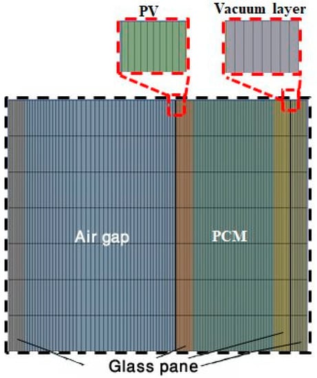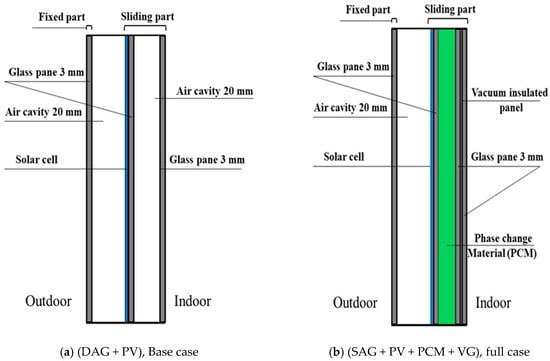 However, the base-case in Figure 1a could suffer from a high heat transfer rate, especially in hot arid or harsh cold climates. Therefore, the second window in Figure 1b is proposed to overcome this problem. In this design, a vacuum gap with a thickness of 0.12 mm attained by an array of micropillars is used to separate two 3 mm glass sheets. This vacuum gap is edge sealed using indium sealing, as detailed in [16]. The silicon wafer is pasted on one side of the glass layer facing the outdoor. The structure of vacuum-based PV is detailed investigated and proved its lower U-value in [17]. Therefore, in this design, the sliding part is the PV with the PCM layer followed with the VG layer. This structure has the benefit of three thermal insulating layers of the external formed air gap, lower thermal conductive PCM layer, and the VG layer. In addition, electrical power generation can be accomplished by the PV layer. Further, the essential function of the thin PCM layer is to accomplish efficient thermal management for the silicon wafer and attain safe and lower solar cell operating temperatures [18]. For easier mentioning, this case is called (SAG + PV + PCM + VG) structure.