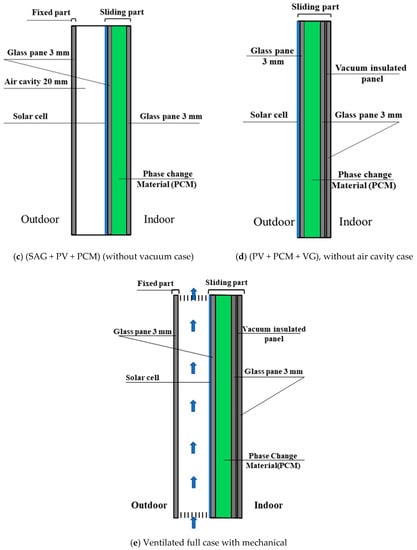 On the other hand, in the currently proposed window designs, the window is constructed from two main parts. The first part is the outside glass regular sheet, while the sliding elements are different. The sliding elements in the current new design consist of different layers to mimic different operating scenarios. These designs combine the conventional SG layer with the photovoltaic (PV) layer, phase change material (PCM) layer, and vacuum glazing (VG) technology. These designs are proposed to reduce the building solar thermal heat gain along with electrical energy generation and providing indoor privacy and security. These scenarios are depicted in Figure 1. All these windows are simulated with an area of 1 m by 1 m. The main advantages of these designs are that they can accomplish very high thermal insulation, lower solar heat gain, and electricity generation. In addition, no conventional shutters are needed because the opaque structure of the used PV layer makes the same function for the shutter with electricity production.