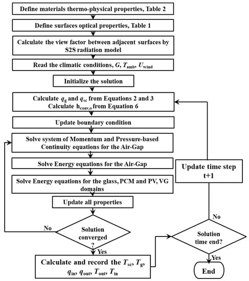 where Qindoor is the heat transmission rate to the indoor air; hconv,i, and Tin are the indoor natural convection and the indoor temperature, and they were taken as 8.1 W/(m2·K) and 25°, respectively [22]. It is worth mentioning that the ambient temperature, solar radiation, and wind speed are varied according to the daytime. Therefore, the estimated heat generation in the glass layer and the silicon layer are time-dependent. In addition to the external forced convection due to the wind effect and the external boundary condition are also time-dependent. To do this, a transient profile for the heat generation in the silicon layer and the glass layer and transient table for the ambient temperature and the external forced convection caused by the wind is imported by ANSYS, and the solution is solved by reading these values at every time step. Figure 3 shows the workflow of Computational Fluid Dynamics (CFD) simulation solution used in the present study. One second time step for 24 h is used through the four cases. The weather condition for Kuwait City (29.3759° N, 47.9774° E) on the 10th of June 2018 is used to make this comparison. Figure 4 shows the variation of weather conditions in the daytime. The hourly variation of solar radiation and ambient air temperature during June, which represents the typical summer day in the Kuwait climate, are shown in Figure 3. The sun rises at 5:00 a.m. and sets at 7:00 p.m. with approximately fourteen hours of solar hours; the maximum solar radiation recorded a value of 860 W/m2 at 11:00 a.m. morning. At the same time, the air temperature fluctuated between the minimum and maximum values of 29 °C and 38 °C at 6:00 a.m. and 2:00 p.m., respectively. The window was oriented to the south direction, and the total solar radiation incident on the window glass surface is the measured value and displayed in Figure 3.