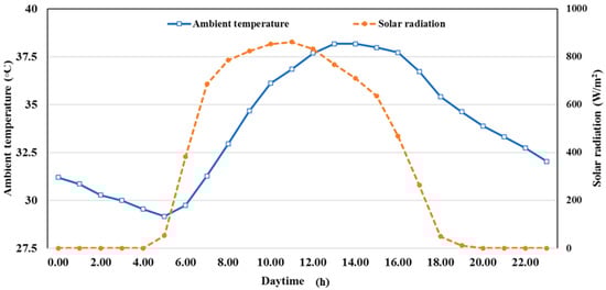 Figure 4. Hourly variation of solar radiation and ambient temperature during 10 June 2018 in Kuwait City.