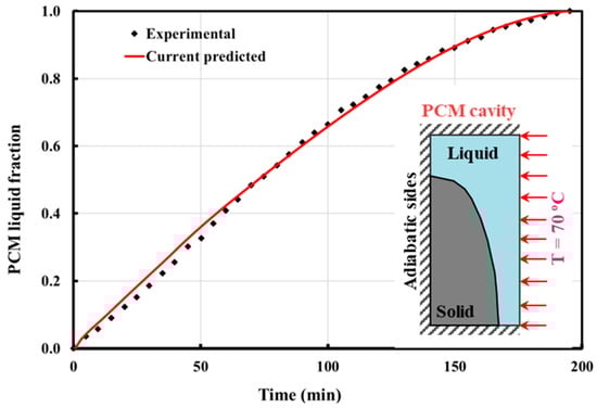 The current model is validated by the authors in their previous studies [22,24] for the PV modeling and the vacuum glazing part. However, the PCM domain is validated with the results in the literature of the PCM cavity [25]. Based on the predicted results, the current model for the PCM domain is in a good agreement with the results of [25], as shown in Figure 5. It is evident that the model accurately predicts the melting history of the PCM contained in the cavity at different inclination angles. Besides, the predicted solid-fluid interface behaves similarly to the experimental captured melting behavior measured by [25] as seen in Figure 6.