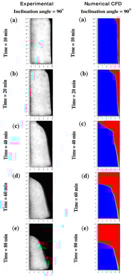 Figure 6. Numerical model validation of the sequential photographs of the melting process of PCM in the rectangular enclosure of Kamkari R. et al. [25] after (a) 10 min, (b) 20 min, (c) 40 min, (d) 60 min, and (e) 80 min.