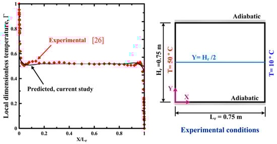 The laminar natural convection in the air cavity is also validated at different conditions. The current model was simulated for a 2D square cavity with an edge dimension of Lr = Hr = 0.75 m [26]. The experiments in [26] were conducted at a left wall at Th = 50 °C and right wall at Tc = 10 °C. The current CFD model is simulated at the same conditions, and the comparison between the predicted and the experimental results of [26] are depicted in Figure 7. In this case, the local temperature on a horizontal line was displayed in a dimensionless temperature form, Γ = (T − Tc)/(ThTc). The predicted local dimensionless temperature variation on a horizontal line locates at y = Hr/2 was compared with their pairs in the experiment. The experimental points are in Figure 7. Therefore, the current CFD model with the mentioned turbulence settings showed a very good agreement with the experimental data in [26].
