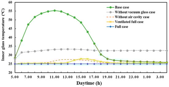 Figure 8. The temperature variation of the inner window surfaces with time for each case on a sunny summer day.