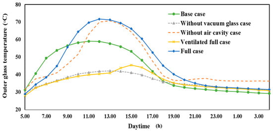 Figure 9. The temperature variation of the outer window surfaces with time for each case on a sunny summer day.