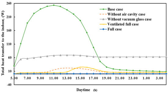 Figure 10. The heat transfer rate variation for each case with time of the inner window surfaces on a sunny summer day.