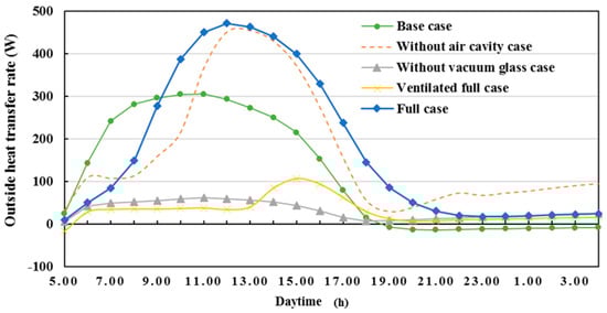 Figure 11. The heat transfer rate variation for each case with a time of the outer window surfaces on a sunny summer day.
