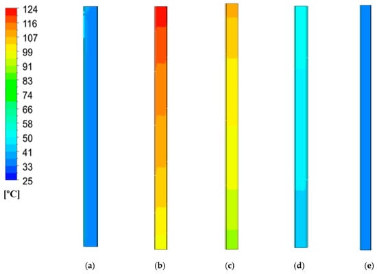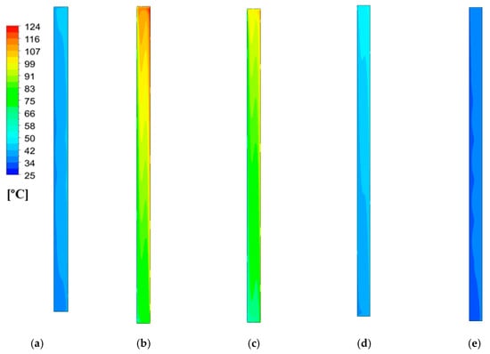Figure 12. Temperature contours for the air cavity of the windows of the full case during one day at time (a) 7:00, (b) 12:00, (c) 16:00, (d) 20:00, and (e) 24:00.