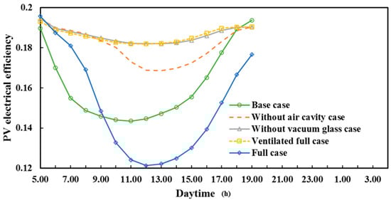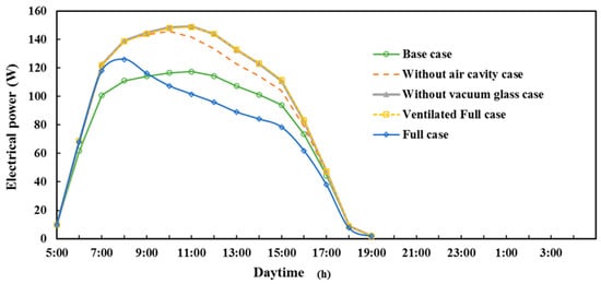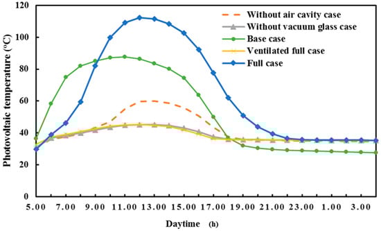 The cell surface temperature is calculated during the daytime, as showed in Figure 15. The peak cell temperature over 112 °C is recorded in the full case, while the minimum peak temperature occurs in the case without vacuum glass, which reaches approximately 42 °C. This clarifies that it is an unsafe operation for the PV in the full case. That is why the ventilated case can be used as another automated scenario to operate the forced fan to decrease the PV temperature. In the case of using the ventilated full case, the heat gain by the building was reduced as previously mentioned besides a safe operation for the PV module can be accomplished as depicted in Figure 15. In this case, the peak PV temperature is around 42 °C. This issue can be easily solved by removing the air cavity via sliding option used in this work. In this case, the PV temperature reaches 60 °C for the case without an air cavity.