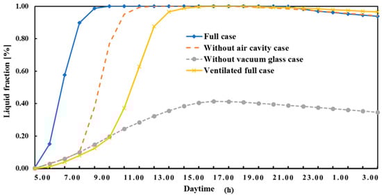 Figure 18. The liquid fraction of the PCM in the different cases.