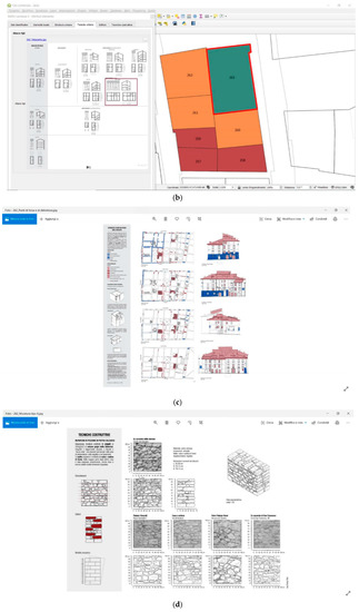 3D models and systems for the gathering of georeferenced data can be queried and implemented to systematically interrelate information on the settlements’ characteristics and seismic vulnerabilities. Data were gathered and organized with regard to territorial conformation, the conformation of the urban development, evolutionary processes of urban fabrics, the characteristics of building types and construction techniques originating from different sources (direct surveys, cadastral mapping, photographs, open-source photos and maps like Google Earth and Google Street View, iconography and historical documents), constructing an information system that also permits pre- and post-quake virtual 3D reconstructions [32,33,34]. The purpose is to access, with continuity, all the information available for the vulnerability assessment on five different scales: territorial, urban settlement, urban fabric, building, details and construction techniques, and their interrelationship. The method was developed and tested on two different inhabited areas: Cornillo Nuovo–a district of Amatrice highly damaged by the 2016 earthquake, and Leonessa–a centre of the crater little damaged by the 2016 earthquake. A database was prepared that contains, organizes, and makes available the following data: