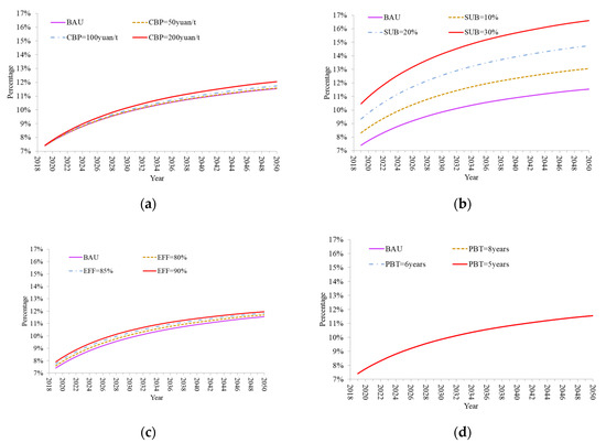 - Reasonable measures to reduce the conversion costs, in line with the phased objectives of social and economic development, should be taken to continuously cultivate and improve the natural gas consumption market. Our simulation results showed that the subsidy tool is key to increasing the share of natural gas in the short term, the effect of carbon trading price adjustment on energy structure is reflected in the long term, and enhanced technologies are reflected in the medium term. Therefore, the subsidy intensity of capacity should be adjusted in a timely manner, according to market fluctuations. At the same time, the carbon trading price and the strength of technology improvement, which show less effects in the short term, should be set based on the expected performance of medium- and long-term market consumption, in order to ensure that the implementation of the measures can take effect in the future and that the coordinated and orderly development of the natural gas market can occur.