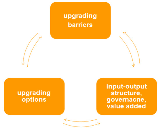- inter-chain or inter-sectoral upgrading: through a lateral move; applying skills acquired in a particular function of a chain to move into a new sector/chain, which is more promising for the future [11,32,80,81,82,83].