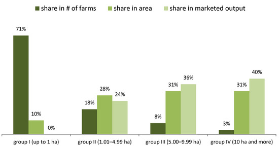 As apple growers remain at the centre of our interest, we commence by analysing issues related to apple production. During the last decade (2010–2019), the average total apple-growing area in Poland was about 177 thousand ha. The apple harvest shows an upward trend with the average annual growth rate of about five percent for the last decade. The growth in total output is primarily the result of the increasing yields of apples following the systematic modernisation of orchards. However, apple production in Poland remains very fragmented [52]—see Figure 3. According to official statistical data, there are about 109 thousand farms with apple orchards. We can distinguish four groups of orchards that clearly differ in terms of size, productivity and role in the market.