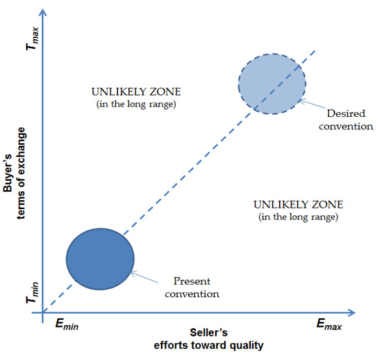 However, to follow that advice, serious constraints have to be overcome in the first place (compare with Figure 1). In our opinion, one of the most important of them is the barrier which Trienekens [33] called market access and market orientation. As we explain in the empirical part of the paper, the upstream transmission of customer needs and expectations within the apple value chain in Poland fails due to the lack of orchestrating incentives and chain member behaviour regarding quality issues (Figure 4). When differences in quality exist that are difficult to verify in advance, an incentive occurs to deliver low-quality products (‘lemons’) to the market. As a result, customers presuppose the risk of buying a ‘lemon’, which leads to a price reduction. It is difficult for the supplier of a high-quality good to convince the buyer that just his particular product is of high quality. As a consequence, the seller will either accept the inadequate (too low) price or refrain from selling at all. Therefore, market relations involving information asymmetry are plagued by adverse selection due to lack of incentives for suppliers to invest in quality and reluctance of many of them (sellers offering lemons) to reveal the true attributes of the product [84]. Relations between seller and buyer contain both cooperative as well as antagonistic and competitive aspects, while neither party has control over all variables characterizing this relationship (compare differences of influence and possible efforts towards quality within the value chain—Table 1). Hence, there is a space for discretionary behaviour of each party and the situation is somehow similar to employment relationships (compare [85]). Let us assume that in the case of the seller, the scope of his discretionary behaviour is determined by the Emin and Emax points denoting, respectively, minimum and maximum effort toward producing or maintaining apple quality. Similarly, in the case of the buyer, we can point to Tmin and Tmax, which mean price and other important criteria for the seller’s conditions of trade—respectively at the minimum level (at which exchange with the seller can still be retained regarding his best alternative available) and at the maximum level (not yet undermining the financial condition of the buyer’s business)—Figure 5