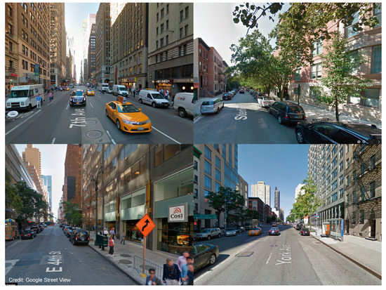 Monitored streets in New York City (top left: 7th Avenue (X7AW), top right: Sterling Place (STPN&S), bottom left: E 44th Street (E44N&S), bottom right: York Avenue (YKAW&E). Images were taken from Google Street View, Map Data: ©2020 Google.