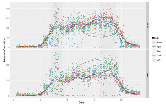 Detailed pedestrian counts indicate a threshold that changes people’s walking behavior. As highlighted in the dashed circles in Figure 5 and Figure 6, pedestrians tend to prefer one side of the street over the other during certain months. For example, more people walk on the east side rather than the west side of York Avenue in May. Green dots appear below the average of the east sidewalk, while those of the west sidewalk are above the average. This seasonal difference is clearer at Sterling Place. In April and May, more blue and green dots appear above the average on the north sidewalk. On the contrary, purple dots (June) are above the average pedestrian traffic on the south edge of the street.