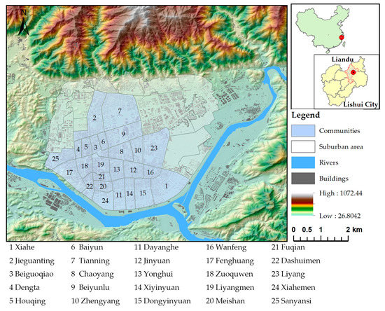 The Liandu District, the main urban area of Lishui City, China, was selected as the study area. Lishui City is located in southeast Zhejiang Province. Liandu District is a unique municipal district, and 25 communities were selected for analysis (Figure 1). The community, like a village, is the smallest administrative and demographic unit in China and is divided by local administrators. The study area covered approximately 45 km2 and is characterized by low-lying topography with hills and mountains to the north and west and the Oujiang River to the south and east.