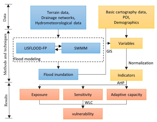 For flood disasters, vulnerability is the tendency towards an adverse effect of the flood. Exposure refers to the elements exposed to flood hazards in a specific region, such as people, buildings, infrastructure, and other personal or public assets. Many studies regard that all receptors can be affected by a disaster in the study area; that is, all receptors should be used for exposure assessment, no matter where they are located [10,36]. In our view, exposure should depend on a specific disaster. For example, the former approach is suitable for disasters with widespread effects, such as earthquakes. However, for disasters where the scope of the effect can be determined, such as floods, the exposure of a population or infrastructure is determined by the extent of flooding and can vary under different flood hazards. Sensitivity is the intrinsic predisposition of an element to be affected by or susceptible to damage with the occurrence of a flood hazard. Adaptive capacity represents the ability of communities, institutions, or people to adjust to the flood, take advantage of opportunities, or respond to consequences. Based on this understanding of vulnerability to urban flooding, the research outline for this study was developed (Figure 2). Different types of urban flooding were simulated using a coupled flood model, which was built using LISFLOOD-FP [37] and the stormwater management model (SWMM) [38]. Flood simulation results were combined with variables to create a set of vulnerability indicators. Components of vulnerability, including exposure, sensibility, and adaptive capacity, were combined from the corresponding indicators using the AHP method. Finally, the vulnerability index was integrated from its components by using the WLC method. In this approach, GIS techniques and methods are frequently used in flood simulation and assessment as a spatial data processing method.