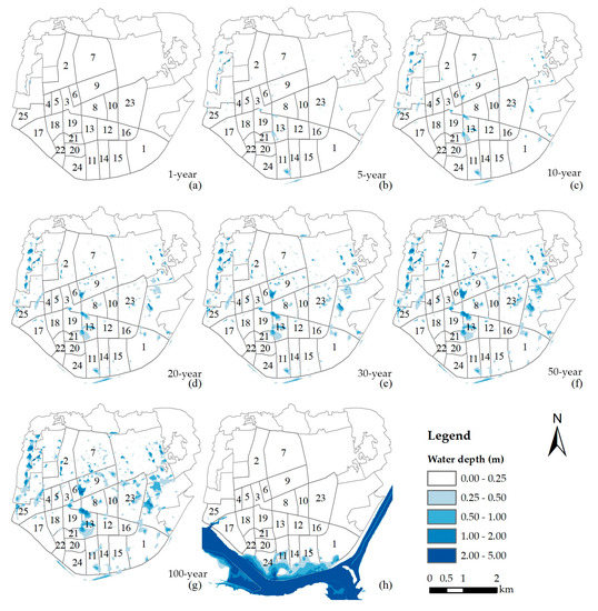 Modeled flood maps of pluvial flooding in Lishui City, China. (a–g) Pluvial floods following (a) 1-, (b) 5-, (c) 10-, (d) 20-, (e) 30-, (f) 50-, and (g) 100-year rainfall; (h) map of the 2014 50-year fluvial flood.