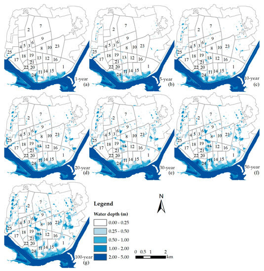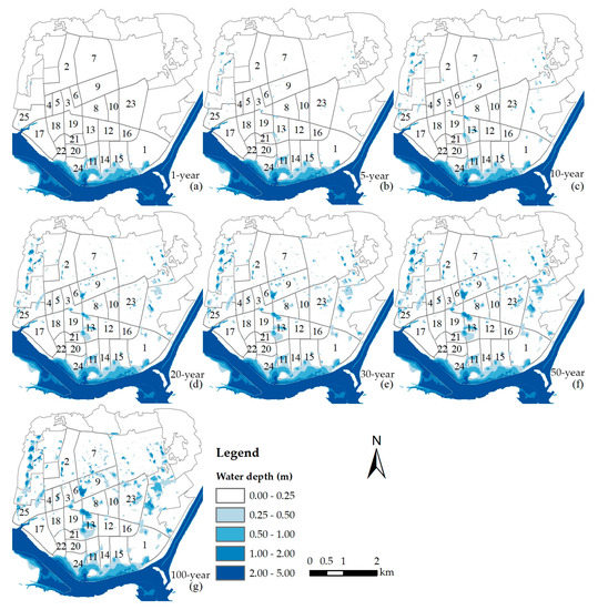 Flood maps of compound flooding in Lishui City, China from the geographical information system (GIS) analysis. (a–g) Compound floods following (a) 1-, (b) 5-, (c) 10-, (d) 20-, (e) 30-, (f) 50-, and (g) 100-year rainfall combined with the 2014 50-year fluvial flood.
