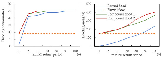 Given the combined effects of rainfall and fluvial flooding, compound floods are more serious than the pluvial flood. Nine communities were affected by more serious flooding than pluvial flooding, with fluvial flooding being the dominant contributor. However, compound and pluvial flooding results were similar when rainfall was 20-year rainfall or less (Figure 6b), with the curve from the modeling method located above that of the GIS method. Thus, the modeling of compound flooding shows a greater flood impact than the GIS method.