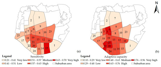 The results of sensitivity and adaptive capacity were divided into four levels using the natural break method (Jenks) [45], as shown in Figure 7. For sensitivity, six communities were at a high level, seven communities were at medium levels, and the remaining were at low and very low levels. All high-sensitivity communities were located in the central urban area, except for community 15, whereas the communities with low and very low sensitivity were located on the edges of the urban area. For adaptive capacity, five communities with high adaptive capacity formed two high-value areas within the city; these communities had easy access to health services and shelters. Communities with low and very low adaptive capacity were predominantly located in the suburban and riverine areas, far from shelters.