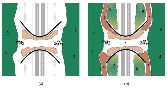 Wildlife overpass areas: (a) according to the intended use, based on references [16,19,20]; (b) according to the proposals [23,24]. Designations: 1—deck area, 2—entrance area, 3—approach area, 4—exclusion fence area, 5—roadside vegetation on the slopes of the road cutting and bridge abutments.