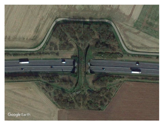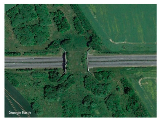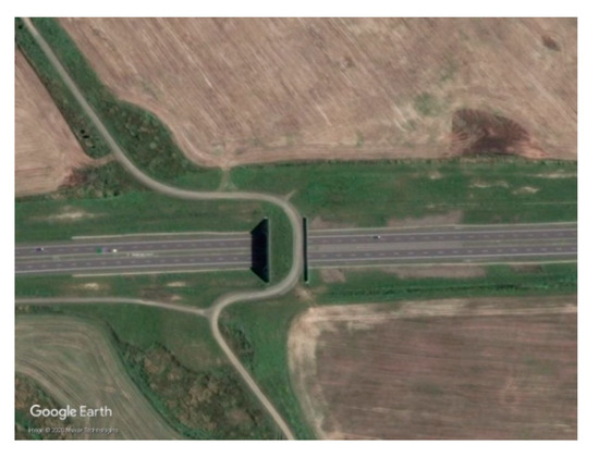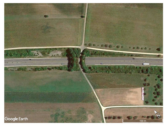 Google Earth images [56] showing the landscape elements and structures in the immediate vicinity of the analysed overpasses are shown in Figure 4, Figure 5, Figure 6, Figure 7, Figure 8, Figure 9 and Figure 10. The landscape elements and structures present within and in the immediate vicinity of the compared wildlife overpasses vary considerably. On two square-shaped crossings, the existing landscape elements and structures in the deck area were considered, comprising shrubs of different species and heights and irregular natural mounds of up to 1 m in height (structure No. 1—Figure 4) and 1.5–2 m high earthen berms contiguous to the noise barriers. This was different in the case of structure No. 3 where earthen berms were up to 3 m high and ran along the crest of the road cutting slope, parallel to the road and contiguous to the noise barriers (Figure 6). The actually existing landscape elements and structures, comprising shrubs of different species and heights, were considered also for two parabolic-shaped bridges (structure No. 2—Figure 5 and structure No. 4—Figure 7). Additionally, on the two next bridges, designated No. 5 and No. 6, the existing landscape elements and structures were considered in the analysis. In the case of structure No. 5, these were double earthen berms, ca. 0.5 m high, running just above the bridge edge and the second earthen berm, up to 2 m high running along the top edge of fill (Figure 8). On bridge No. 6, it was a single, ca. 0.5 m high earthen berm running along the bridge edge on the top line of fill (Figure 9). The last of the analysed structures, designated No. 7, was distinguished by the very poor presence of landscape elements and structures, limited to grass cover, both on the slopes and in the deck area (Figure 10). In modelling the noise levels on wildlife overpasses located in rural areas, in order to enable comparative analysis of the landscape elements and structures present in the approach area, it was assumed that cereals grow to a maximum of 1 m high. Conversely, for the slopes of road cuttings, the actual conditions noted at a given structure were considered, i.e., plantings- or grass-covered areas, as can be seen on the satellite images of the analysed structures (Figure 4, Figure 5, Figure 6, Figure 7, Figure 8, Figure 9 and Figure 10). Four crossing structures were built before 2000, two in France (Figure 5 and Figure 7) and two in Germany (Figure 8 and Figure 9). The next two structures, located in Germany, were built around 2002 (Figure 4) and around 2007 (Figure 6). The last of the analysed crossings was built in Poland in 2009 (Figure 10).