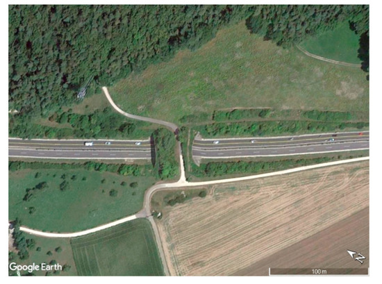Wildlife overpass No. 4. [56] (50°15′31.52″ N, 1°44′50.32″ E, A16 near the village of Forest-Montiers, France).