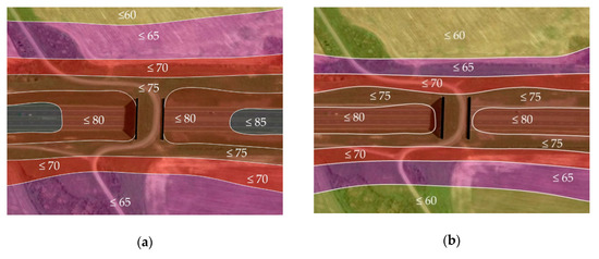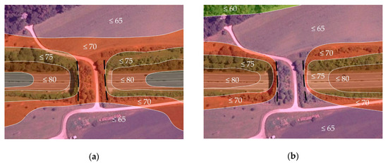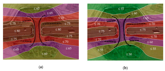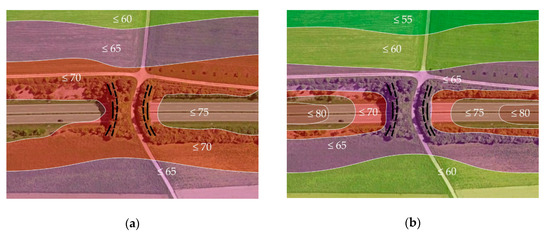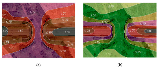 Noise map of the crossing structure No. 5 plotted on a Google Earth satellite image [56]: (a) in the evening; (b) in the morning. The long-dashed line designates the earthen berm on the fill crest and short-dashed line designates the berm that determines the passage width. The noise levels are given in dB(A).